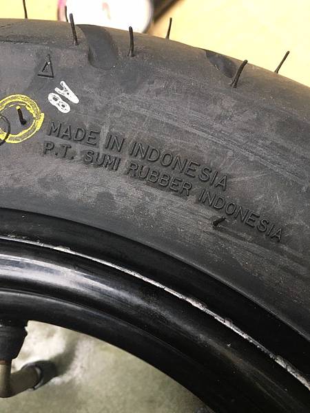 ▲Made in Indonesia 印尼製造,上圖黃色標記是對準氣嘴安裝的記號,正好也有「輪胎安全線」的三角記號,大家可以看一下。