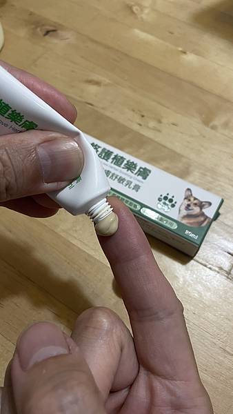 ▲「植樂膚草本皮膚舒敏乳膏」擠出來的是淺米色質地微濕潤不粘膩、無異味(寵物皮膚外用)。