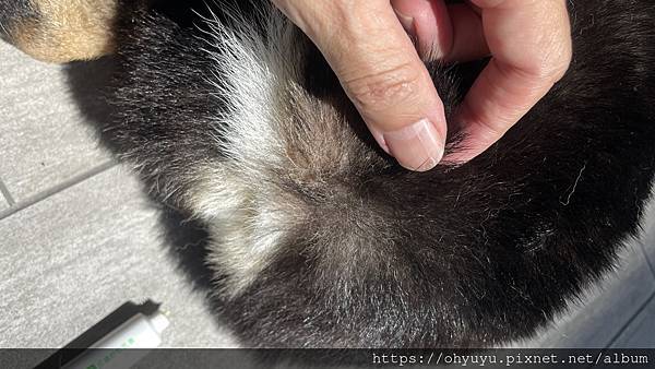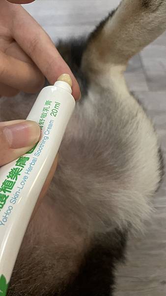 ▲擦藥時候 狗狗也因為成分不刺激乖乖的躺著讓我擦。