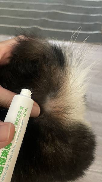 ▲「植樂膚草本皮膚舒敏乳膏」塗抹在柴犬皮膚上很容易推開。
