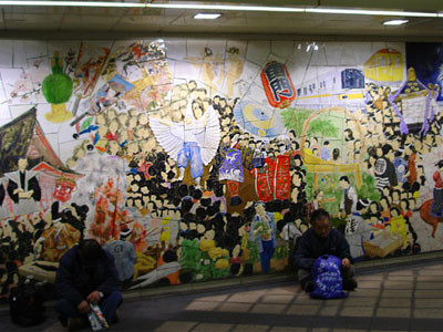 有廟會煙花也有舞龍...當然,車站難免會有人坐在畫下面逗留的...