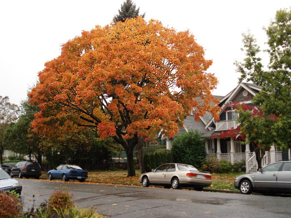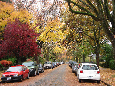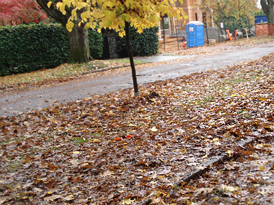 雨後,枯黃的樹葉全部落在道路上,有的連人行道都被遮滿了